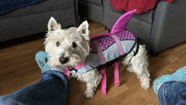 Perfecto, aún no lo hemos usado, pero encaja perfectamente. Talla M para un terrier blanco adulto.